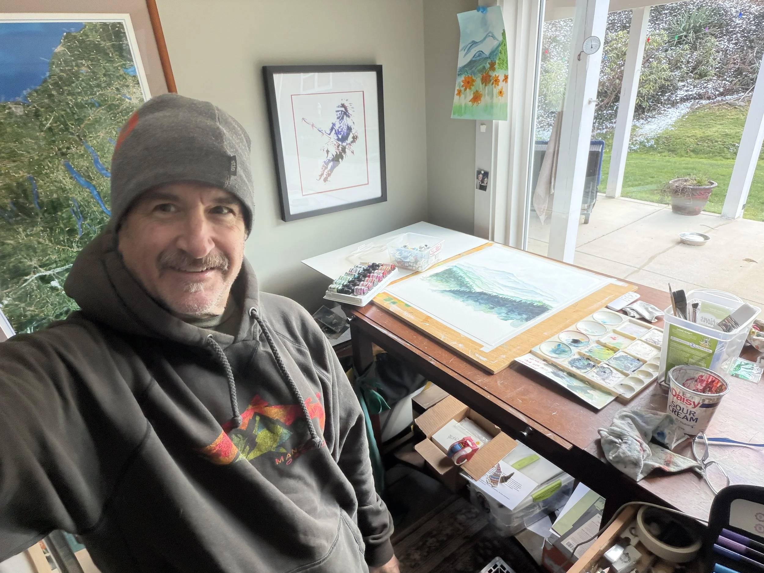 Gregβs work is on view at locations throughout Western North Carolina and has been collected across the US, Europe, and Japan, with select pieces available in limited print runs. He takes commissions, teaches watercolor locally one to three times a year, and brings a sharp design eye to everything he makes. Greg holds an Illustration/Graphic Arts degree from Syracuse University and spent years in the t-shirt world, work that continues today through design and production for local businesses.