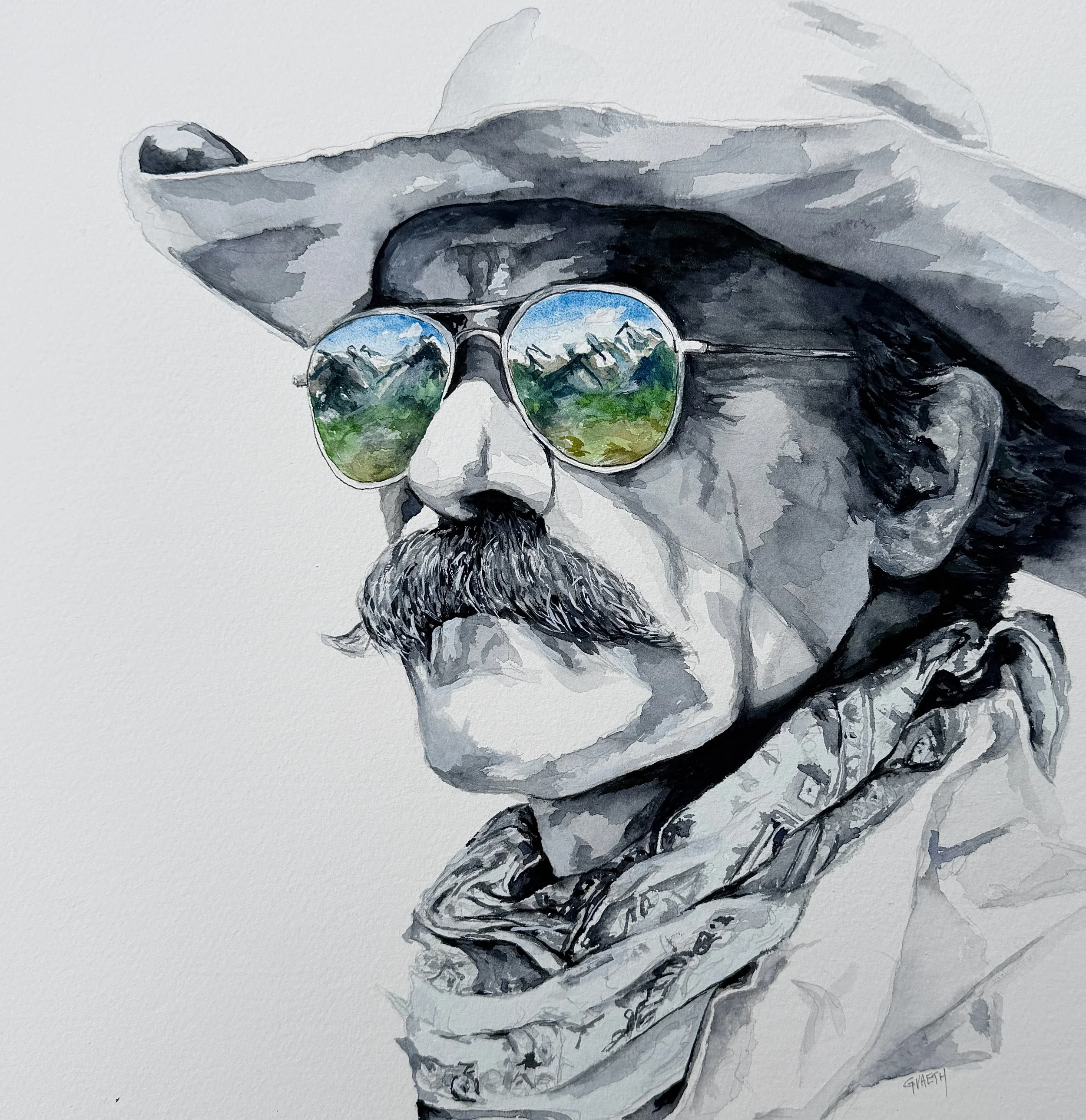 Greg has lived on a small farm in Haywood County with his lovely wife, Danielle, for nearly 20 years. He works primarily in watercolor and pen/ink, with occasional acrylic, out of a home studio. His subject matter is rooted in the outdoors and Appalachian culture and history. Think: bears, Cherokee, cowboys, and the rugged, beautiful landscape.